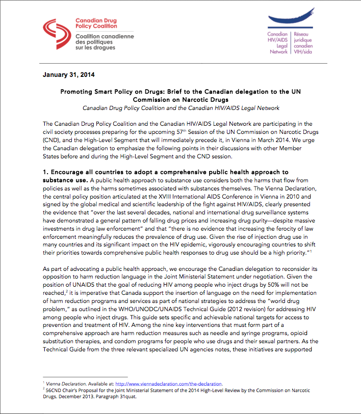 Brief to the Canadian delegation to the UN Commission on Narcotic Drugs (CND) from Canadian Drug Policy Coalition and the Canadian HIV/AIDS Legal Network